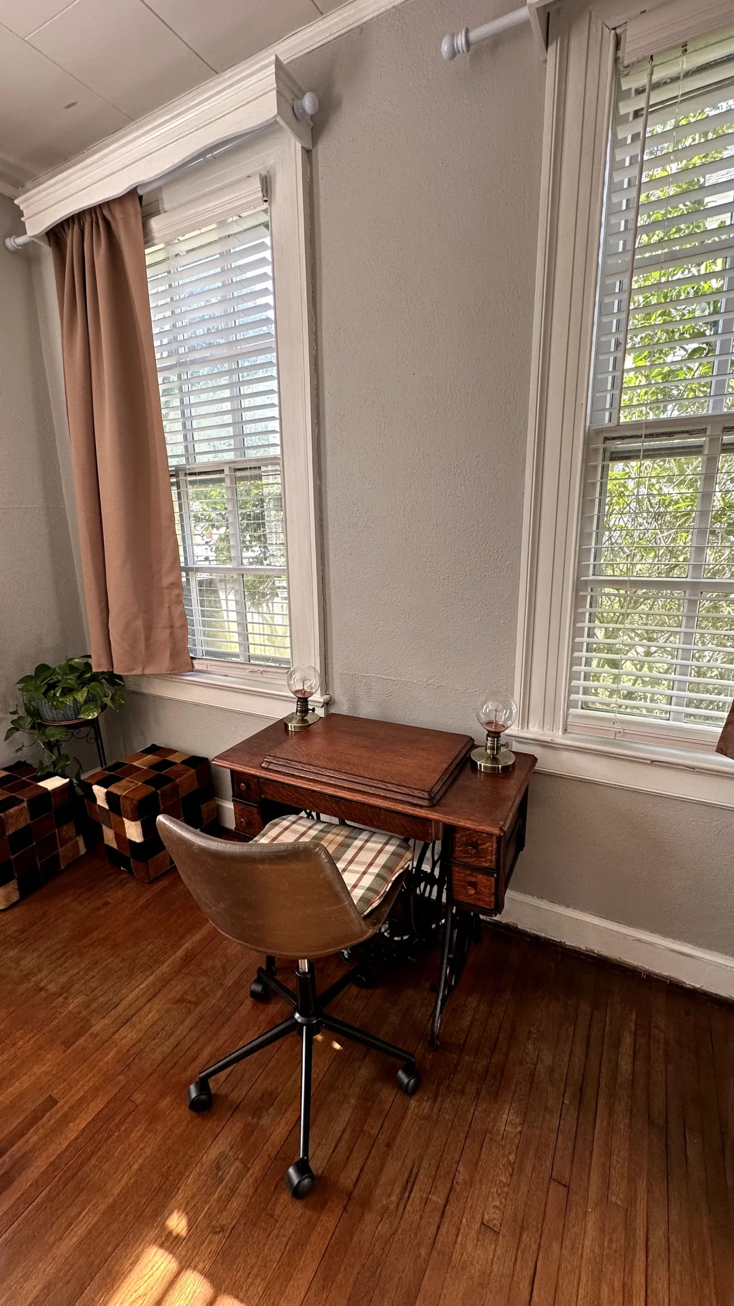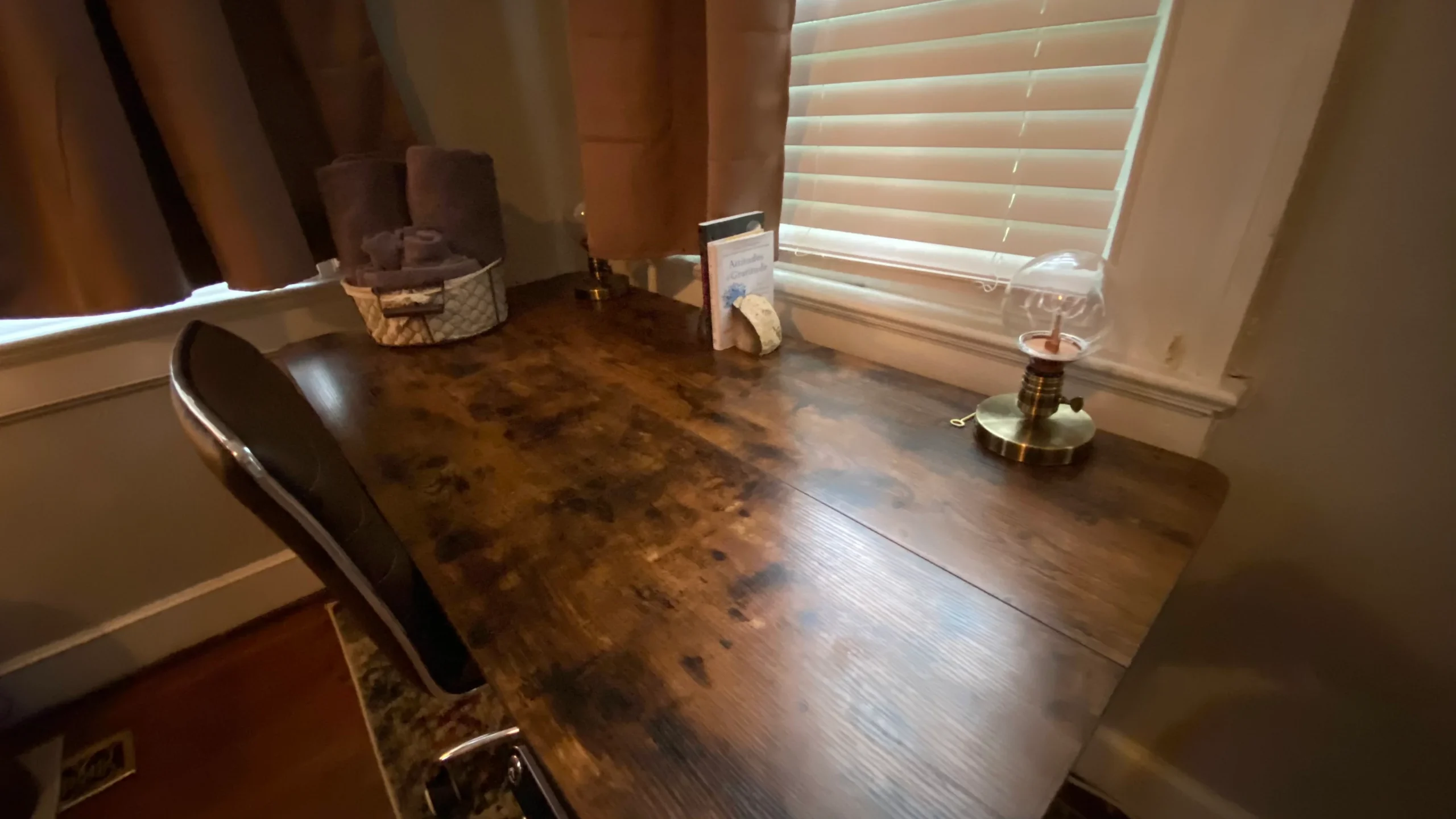 A standing desk is provided for a comfortable workspace.