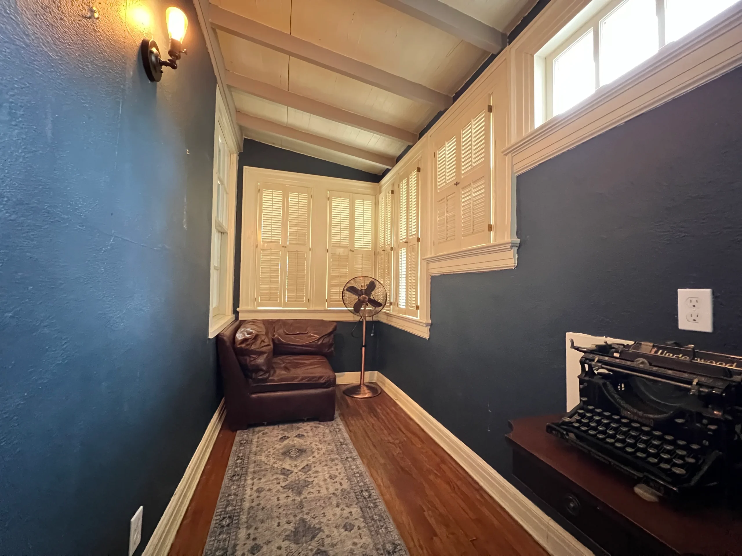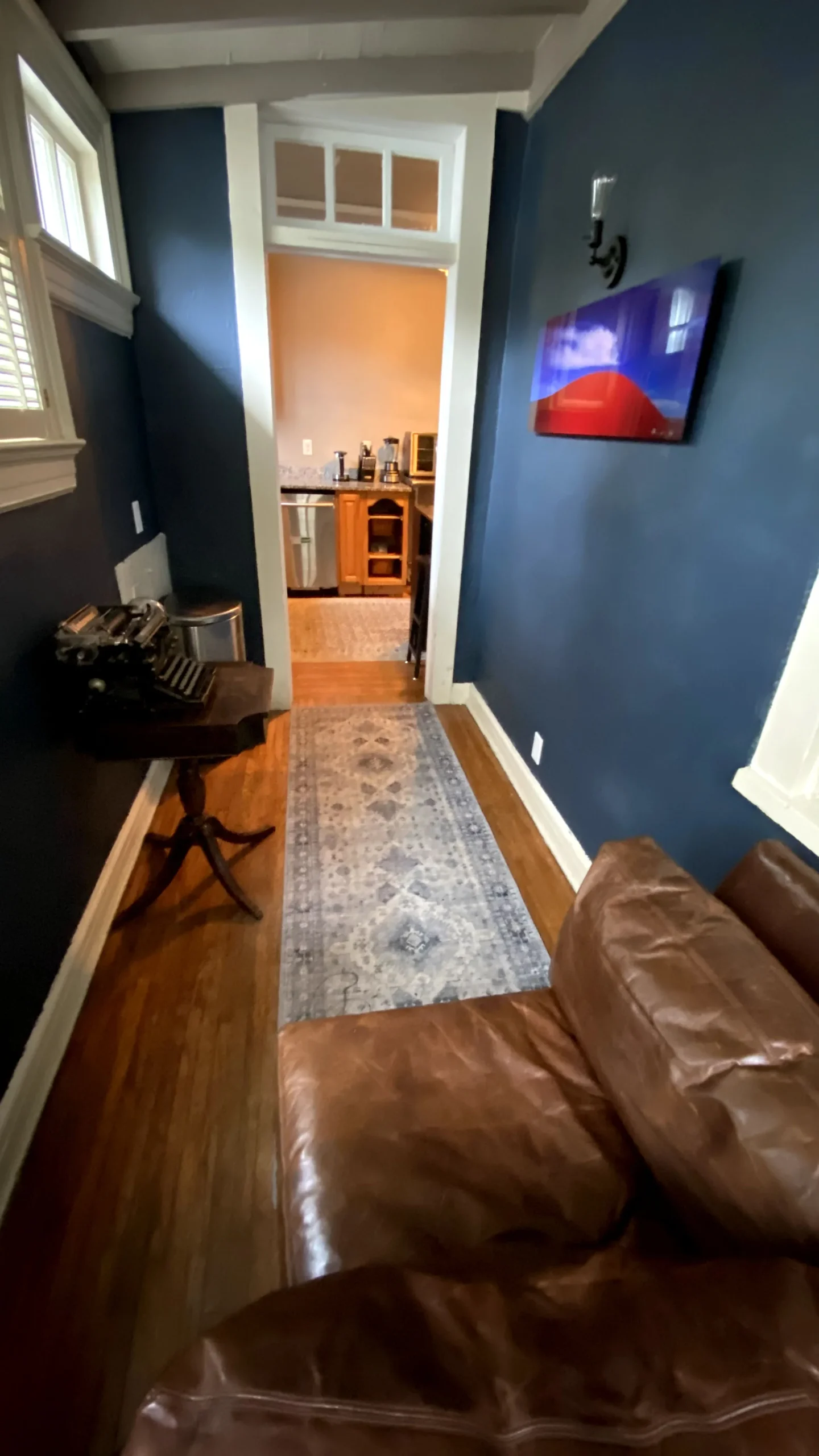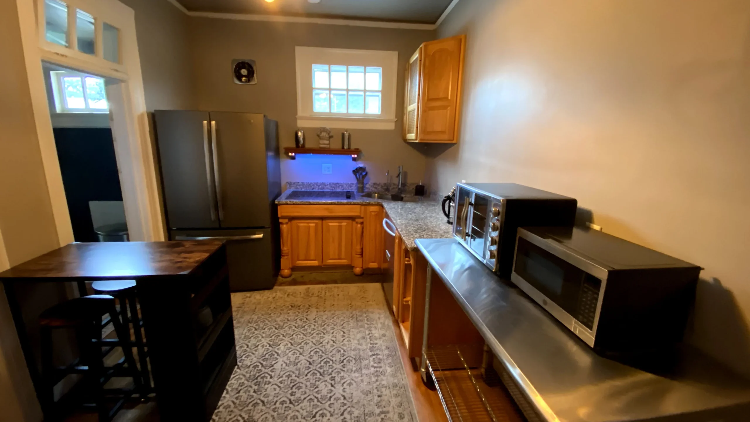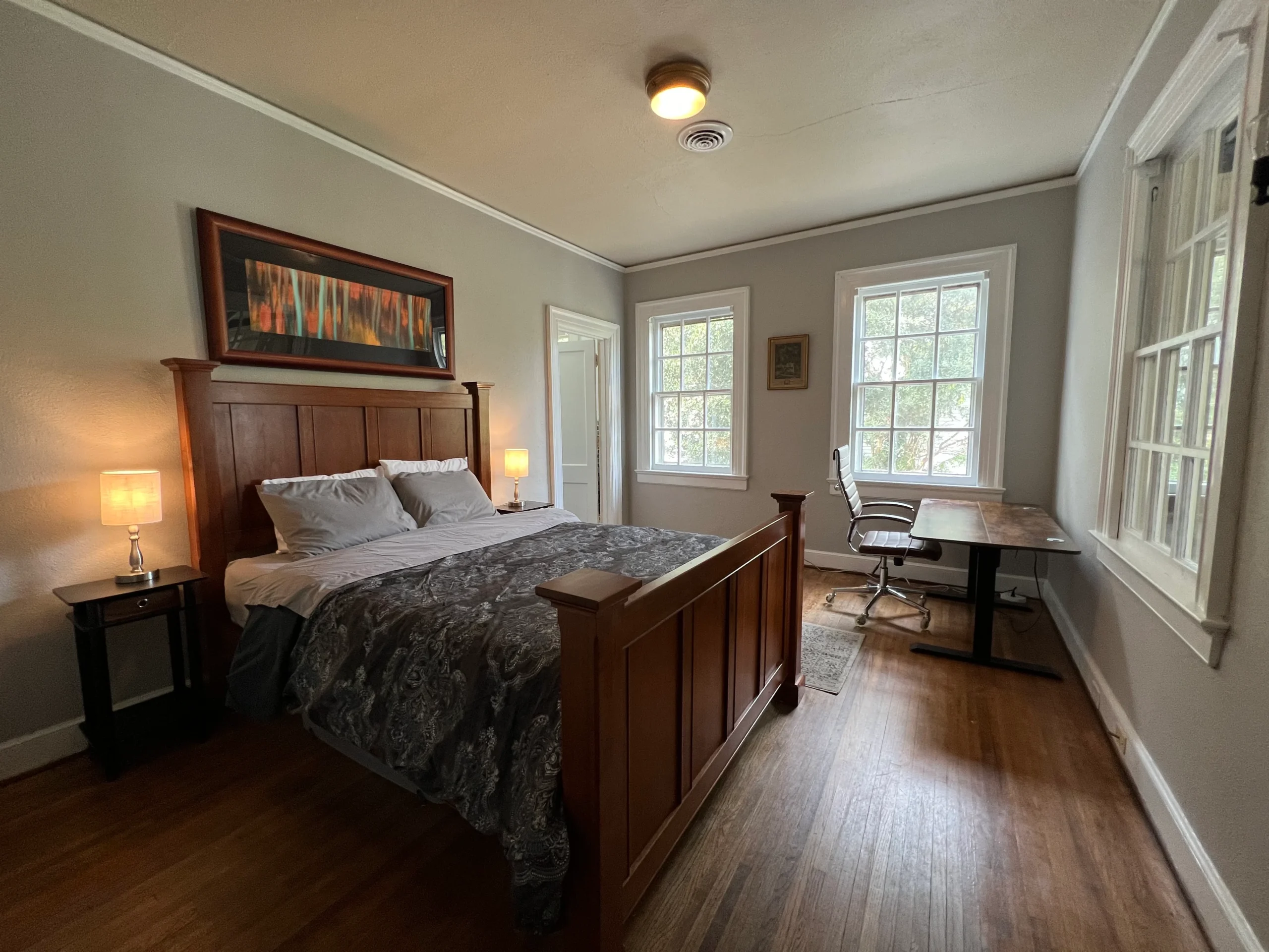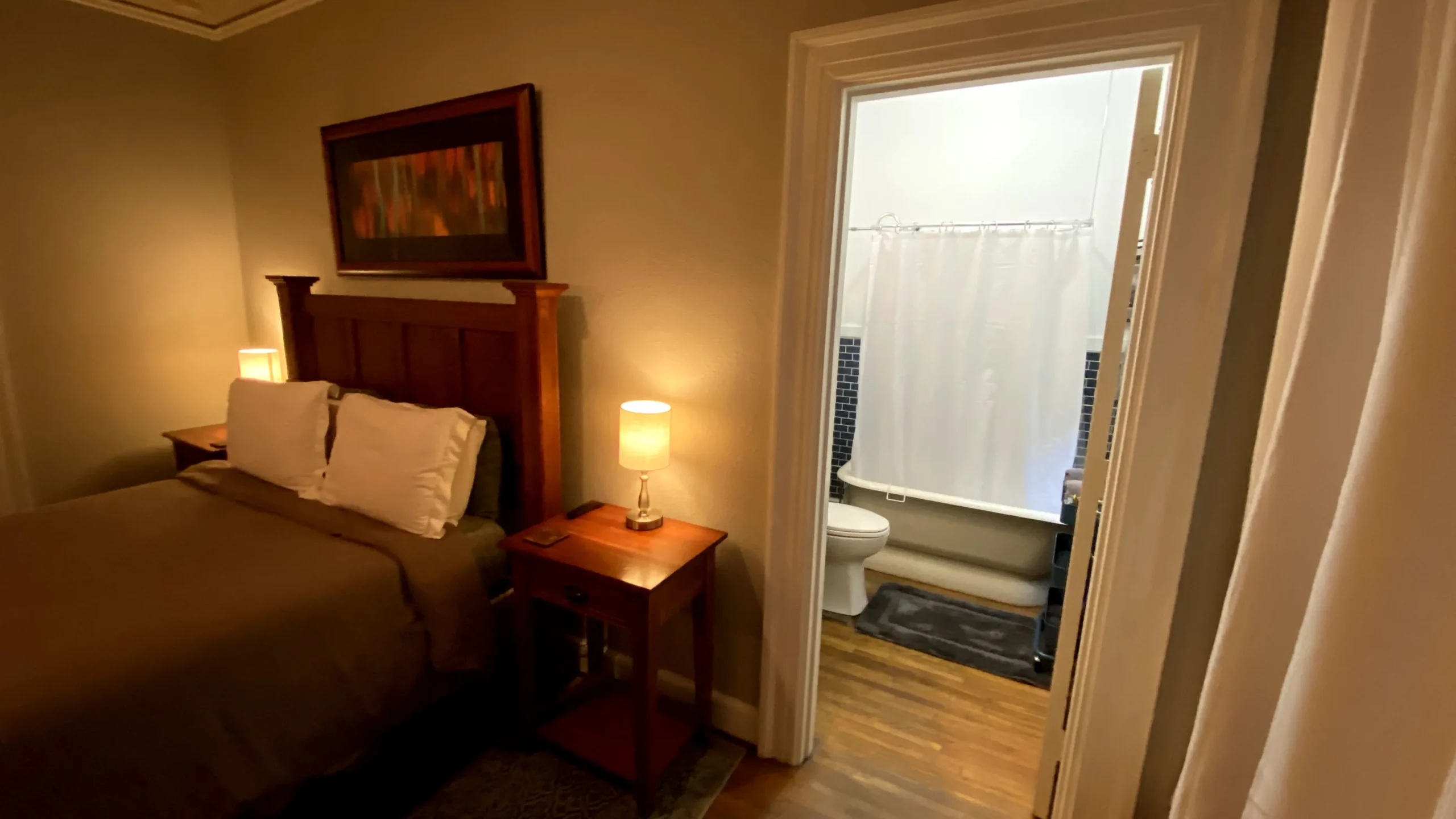 This 2nd-floor room sleeps 2 and includes a private eat-in kitchen and a separate sitting room. It features a private full bathroom with a pedestal tub and original wood floors. Guests also have access to the mansion's formal dining room, high-speed WIFI, and laundry facilities.