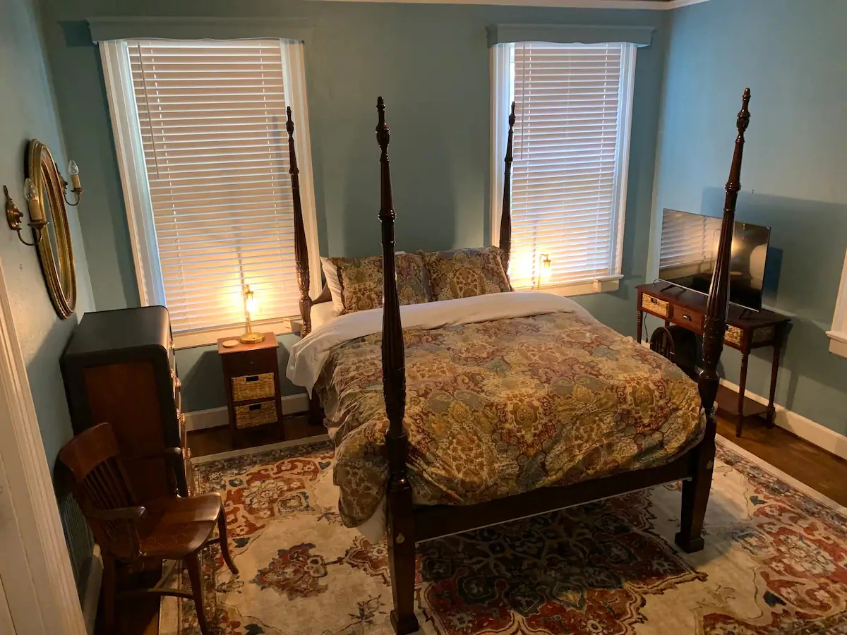 A centrally located 1st-floor room that sleeps 2, featuring original wood floors. Guests can relax in the formal living room or enjoy the outdoors in the garden and patio. The stay includes high-speed WIFI, regular housekeeping, and coffee and tea available downstairs.